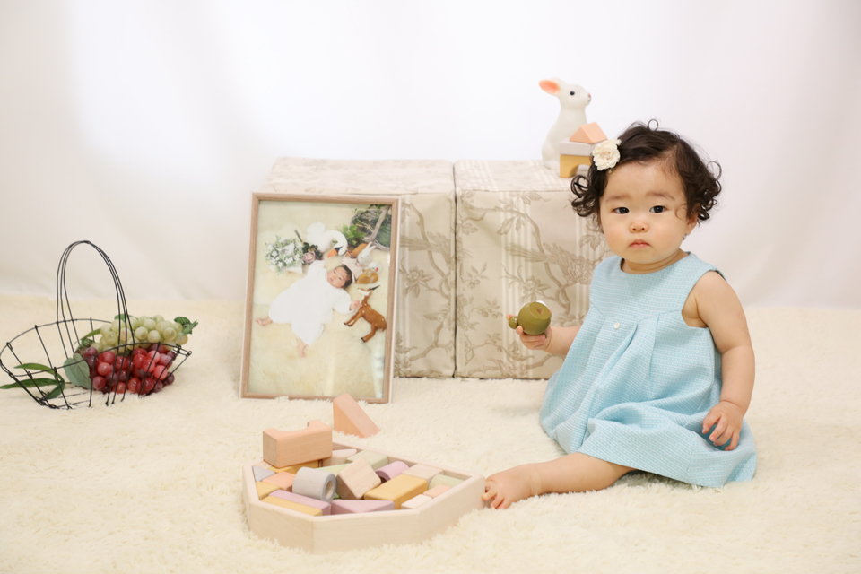 こちらはお宮参りのときにお撮りしたおこさんが、1歳になってまたバースデー撮影にいらしてくださった写真です。