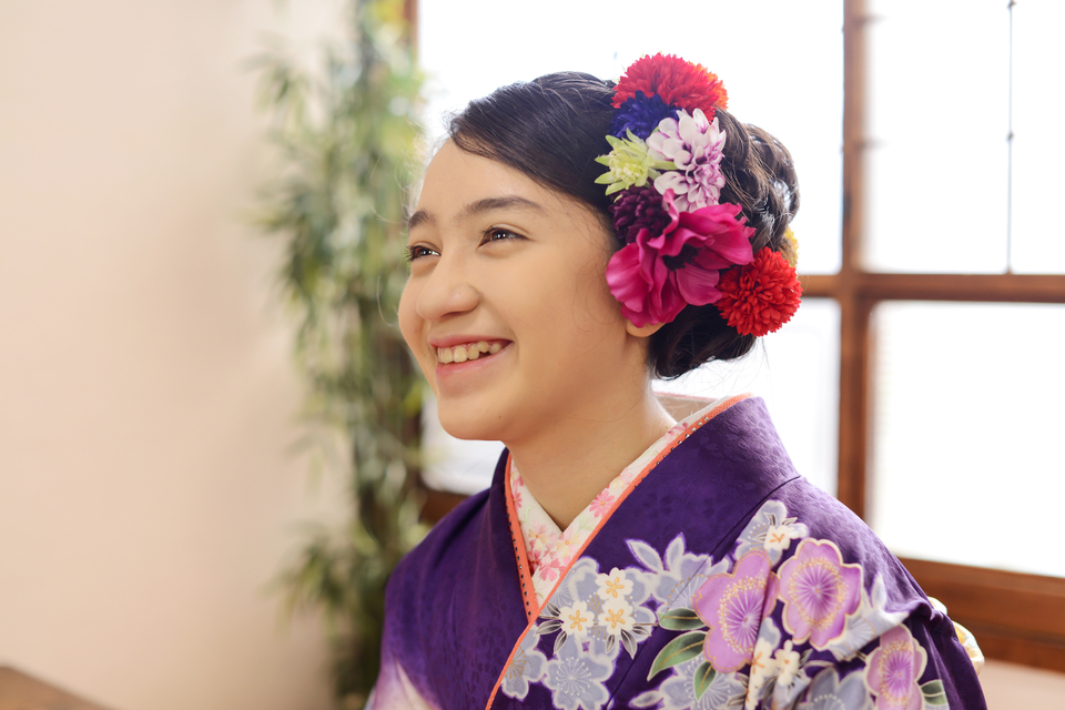 お着付けとヘアメイクは、いつもお世話になっている美容室 クローバーさん。さすがの腕前です。